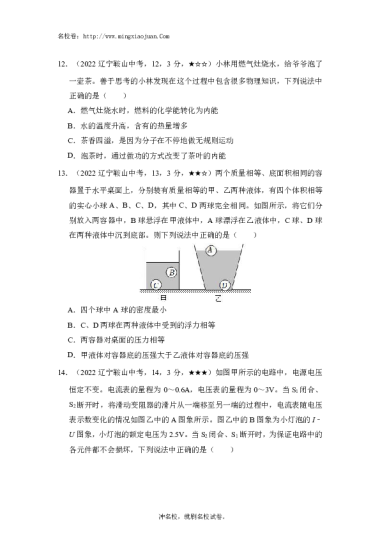 转载请注明出处: 名校卷 » 辽宁省鞍山市2022年初中毕业生学业物理考试-原题