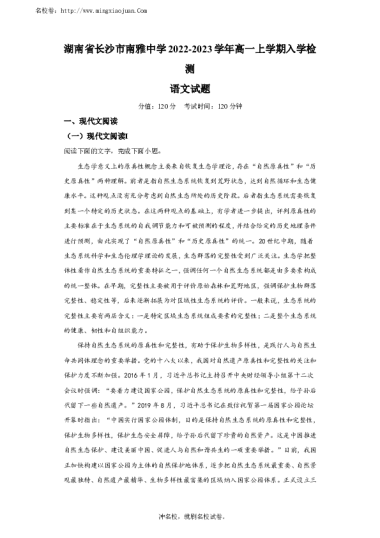 转载请注明出处: 名校卷 » 长沙湖南省长沙市南雅中学2022-2023学年高一上学期入学检测语文试题