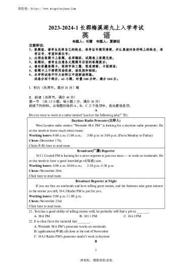 2023-2024-1长郡梅溪湖中学初三入学考试英语试卷(含答案)