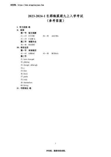 转载请注明出处: 名校卷 » 2023-2024-1长郡梅溪湖中学初三入学考试英语试卷(含答案)
