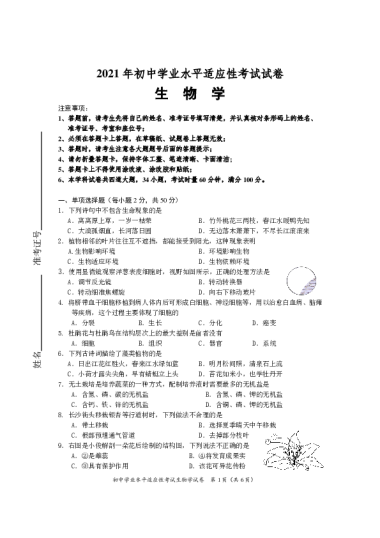 转载请注明出处: 名校卷 » 2021生物适应性试题(A)
