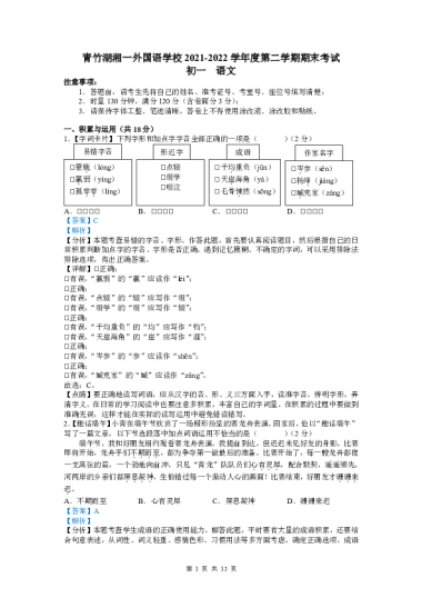 青竹湖湘一外国语学校2021-2022学年七年级下学期期末考试语文试题(答案解析+范文)