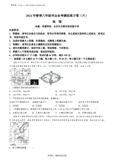 转载请注明出处: 名校卷 » 2024年春季八年级毕业会考模拟练习卷(六)地理