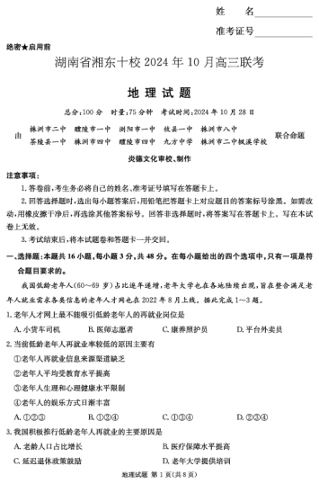 转载请注明出处: 名校卷 » 湖南省湘东十校2024年10月高三联考地理试卷(湘东十校10月联考)