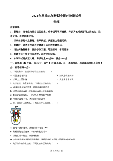 精品解析:湖南省长沙市长郡双语实验中学2022-2023学年九年级上学期期中考试物理试题(原卷版)