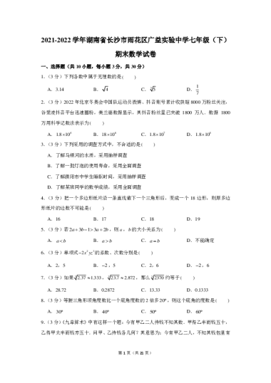 14.2021-2022学年湖南省长沙市雨花区广益实验中学七年级(下)期末数学试卷解析