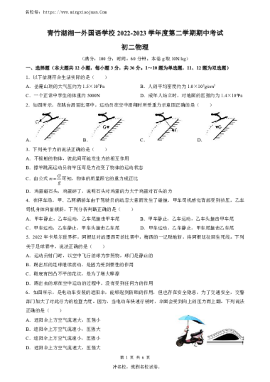 转载请注明出处: 名校卷 » 青竹湖湘一外国语学校2022-2023学年度第二学期期中考试初二物理