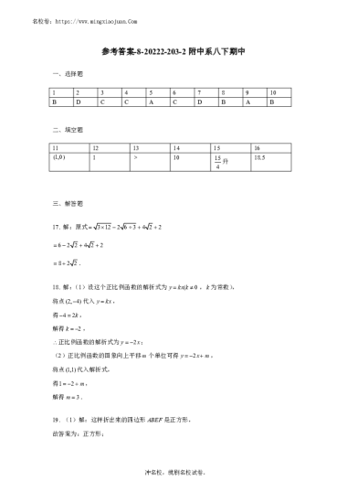 转载请注明出处: 名校卷 » 【数学】2022-2023:附中系八年级下学期期中考试数学试卷(含答案)