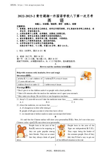2022-2023-2青竹湖湘一外国语学校初二第一次月考英语试卷(含答案)
