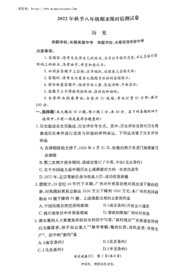 转载请注明出处: 名校卷 » 2022-2023-1长郡教育集团初二期末历史试卷(含答案)