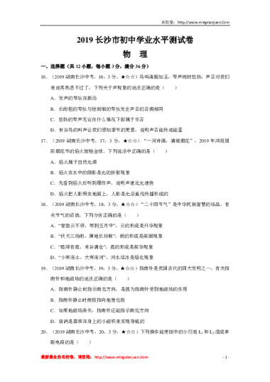 转载请注明出处: 名校卷 » 2019长沙市初中学业水平测试卷物理