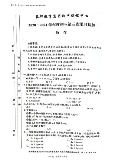2020-2021-1长郡教育集团初三第三次月考数学试卷(含答案)