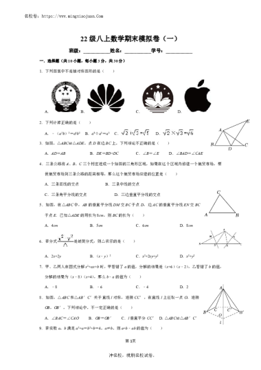 转载请注明出处: 名校卷 » 22级八上数学期末模拟卷(一)