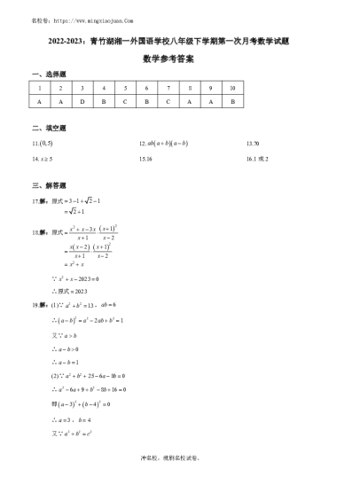 转载请注明出处: 名校卷 » 【数学答案】2022-2023:青一·八年级下学期第一次月考数学试题
