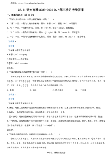 转载请注明出处: 名校卷 » 23.11语文南雅2023-2024九上第三次月考卷答案