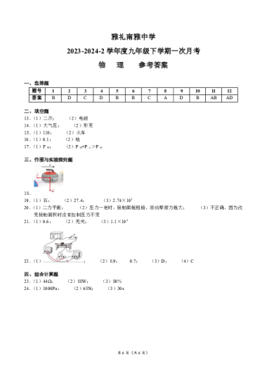 转载请注明出处: 名校卷 » 雅礼南雅2023-2024-2九下一次月考物理(含参考答案)