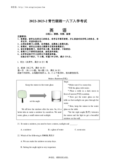 转载请注明出处: 名校卷 » 长沙2022-2023-2青竹湖湘一八下入学考试英语