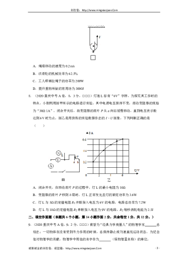 重庆市2020年初中学业水平暨高中招生考试物理试题(A卷)