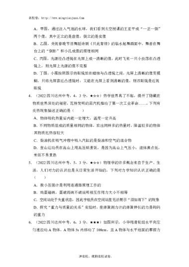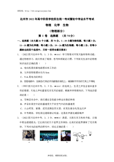 转载请注明出处: 名校卷 » 达州市2022年高中阶段学校招生统一考试暨初中学业水平考试物理化学生物(物理部分)-原题