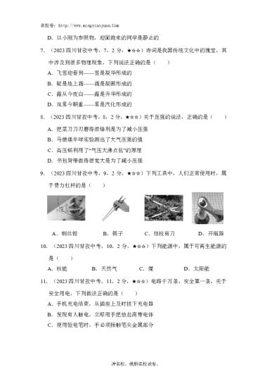 转载请注明出处: 名校卷 » 甘孜州二〇二三年初中学业水平考试物理试卷-原题