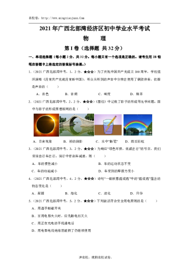 转载请注明出处: 名校卷 » 2021年广西北部湾经济区初中学业水平考试物理