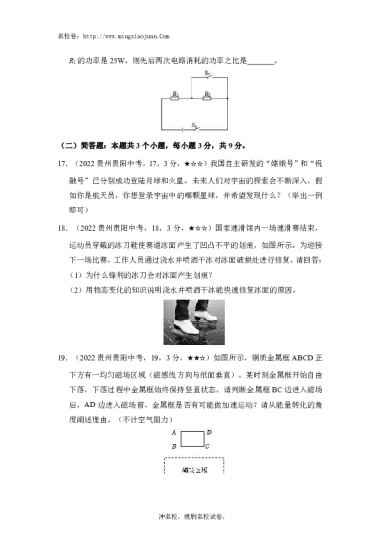 转载请注明出处: 名校卷 » 贵阳市2022年初中学业水平考试试题卷综合理科物理部分第Ⅰ卷-原题