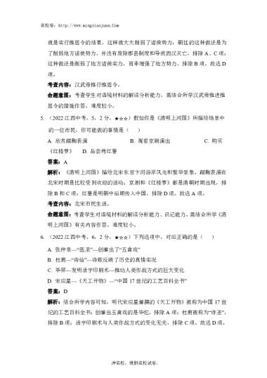 转载请注明出处: 名校卷 » 江西省2022年初中学业水平考试历史试题卷-解析