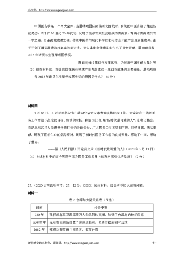 转载请注明出处: 名校卷 » 2020年昆明市初中学业水平考试历史试题卷