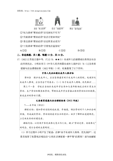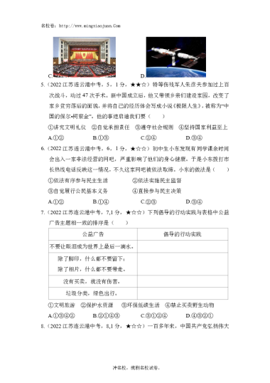 转载请注明出处: 名校卷 » 连云港市2022年高中阶段学校招生统一文化考试道德与法治试题