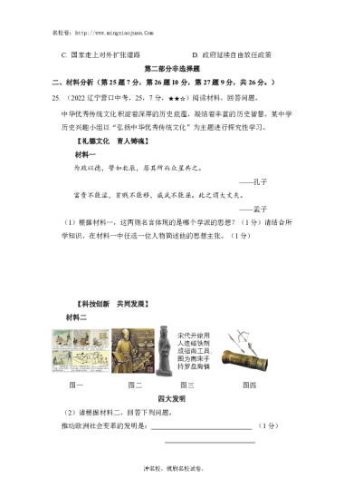转载请注明出处: 名校卷 » 2022年辽宁初中毕业生毕业升学考试历史试卷-原题