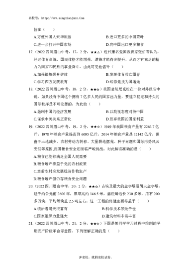 转载请注明出处: 名校卷 » 眉山市2022年初中学业水平暨高中阶段学校招生考试历史-原题