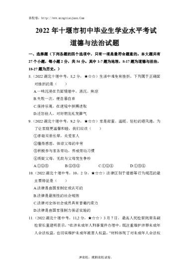 转载请注明出处: 名校卷 » 2022年十堰市初中毕业生学业水平考试道德与法治试题