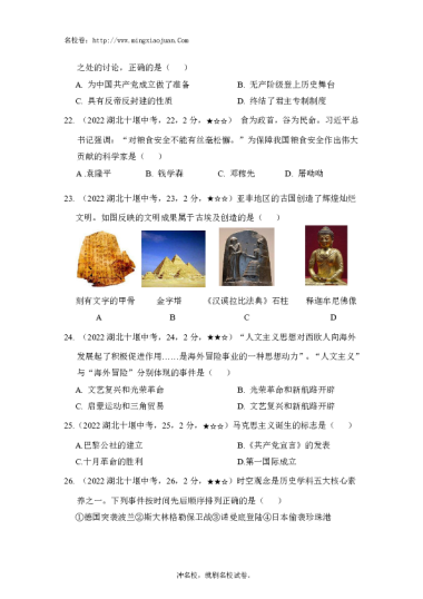转载请注明出处: 名校卷 » 2022年十堰市初中毕业生学业水平考试历史-原题
