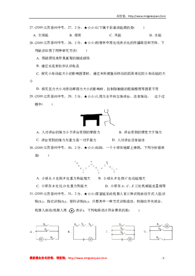 转载请注明出处: 名校卷 » 泰州市2019年初中学业水平考试物理部分