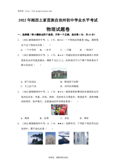 2022年湘西土家苗族自治州初中学业水平考试物理试题卷-原题