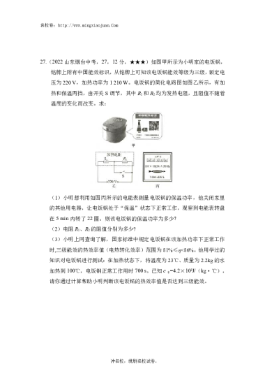 转载请注明出处: 名校卷 » 2022年烟台市初中学业水平考试物理试题-原题
