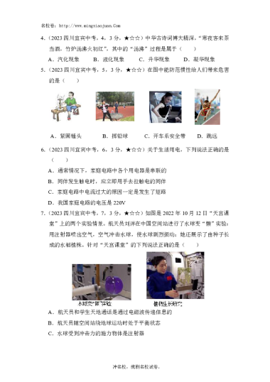 转载请注明出处: 名校卷 » 宜宾市2023年初中学业水平考试暨高中阶段学校招生考试物理-原题