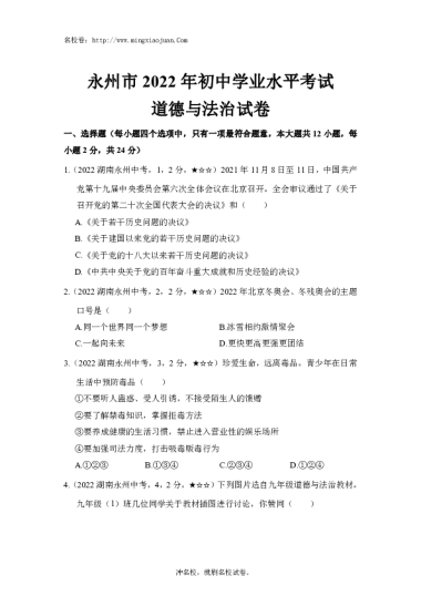 转载请注明出处: 名校卷 » 永州市2022年初中学业水平考试道德与法治试卷